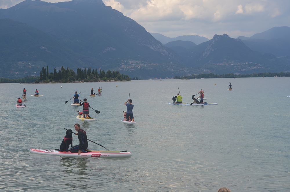 Venti cani di varie razze tranquillamente trasportati a bordo delle tavole per il parco naturalistico della Rocca di Manerba. Tanto entusiasmo e tanto divertimento tra bagni e tuffi per poi terminare la serata con una cena in spiaggia a base di pizza e crocchette.